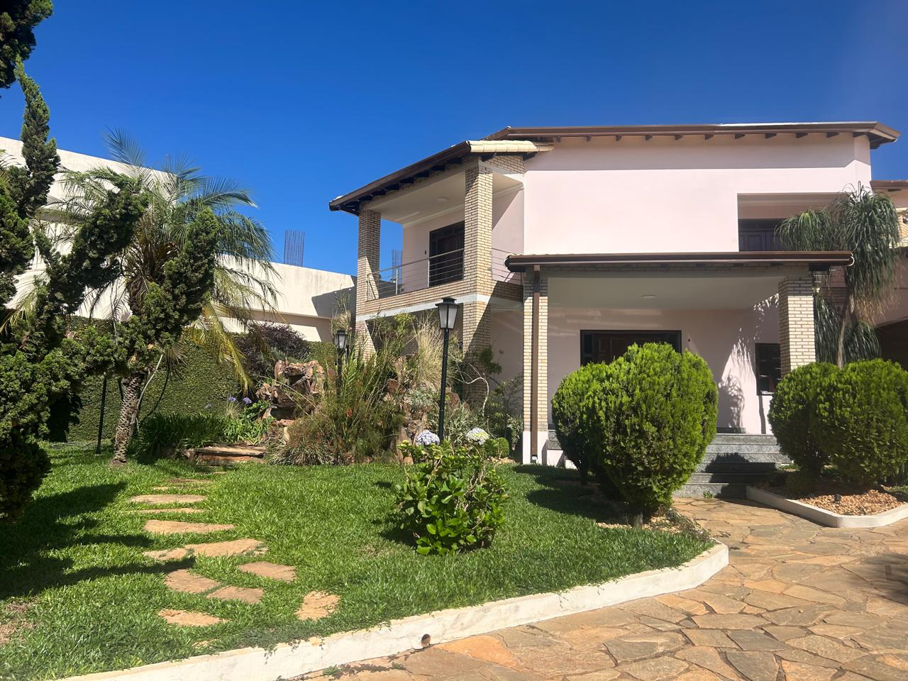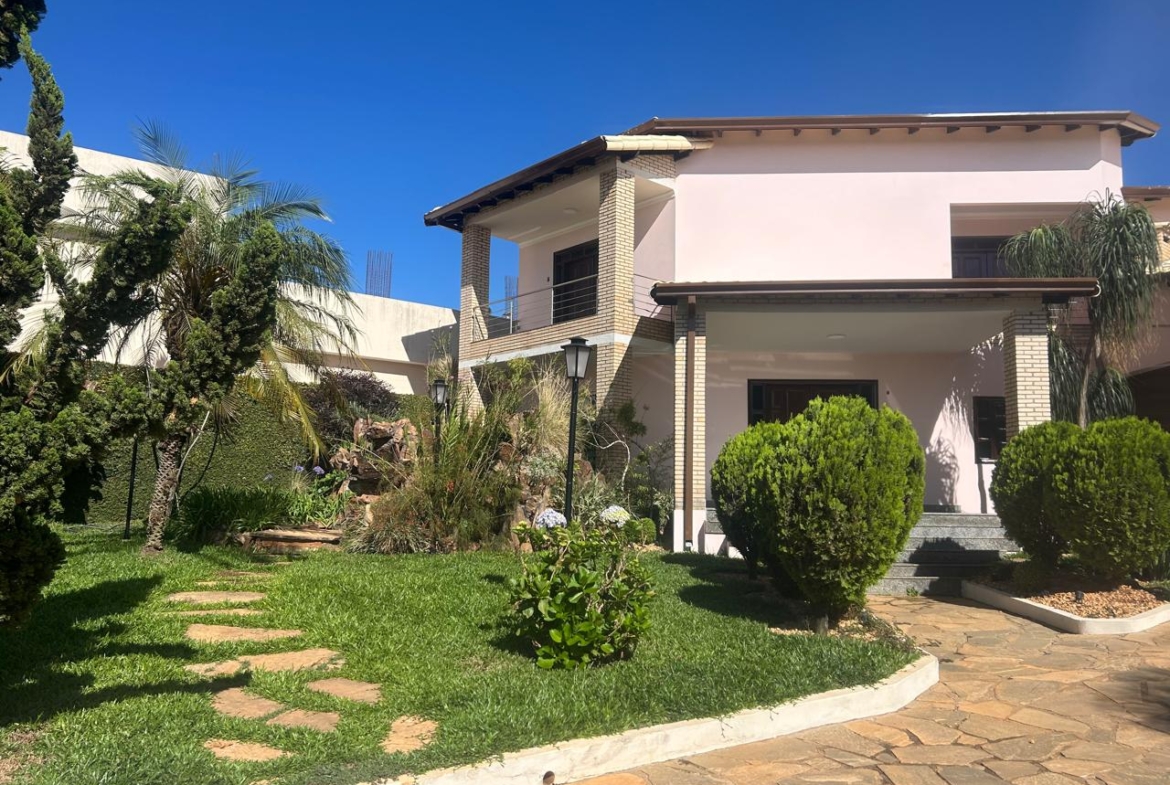 A área externa é completa: churrasqueira, piscina, sauna, jardim bem cuidado e 12 vagas de garagem.